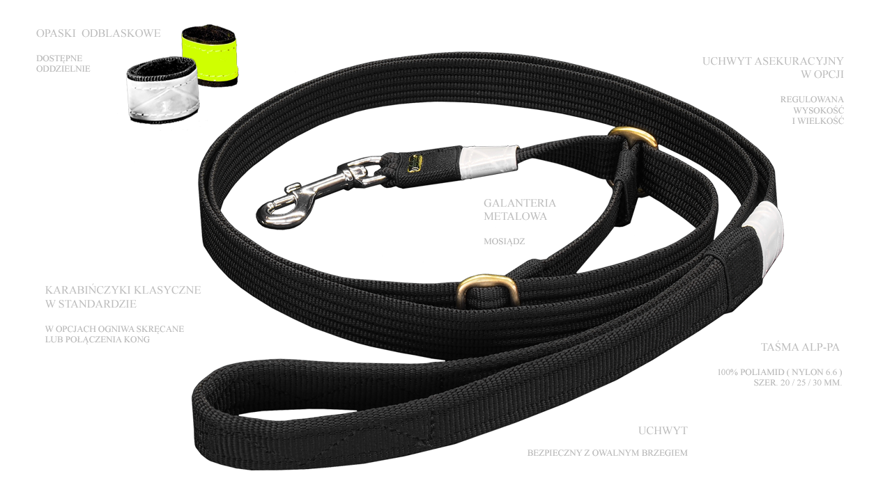 Także w opcji, smycz klasyczna może zostać zaopatrzona w uchwyt asekuracyjny