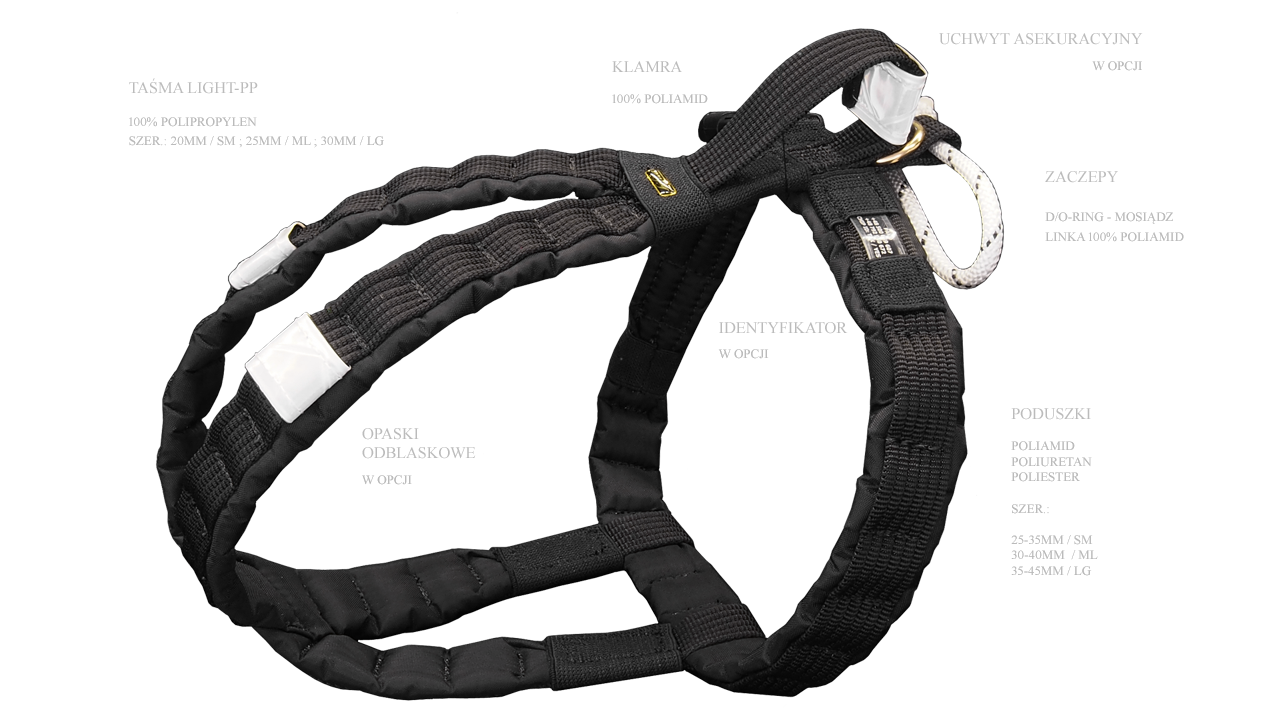 Szelki i uprzęże szyte są miarę indywidualnie dla każdego klienta z Gwarancją Dopasowania.