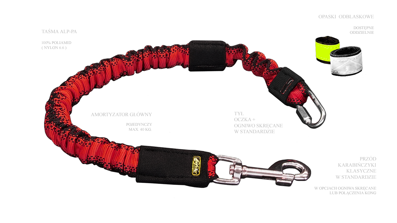 Amortyzatory są dostosowywane do masy pieska. Tutaj prosimy o wybór wielkości karabińczyków stosownie do wagi, pamiętając o temperamencie - dla spokojnego klienta 45kg, można wybrać przedział do 40kg i odwrotnie, dla silnie szarpiącego 35kg - pow. 40kg.