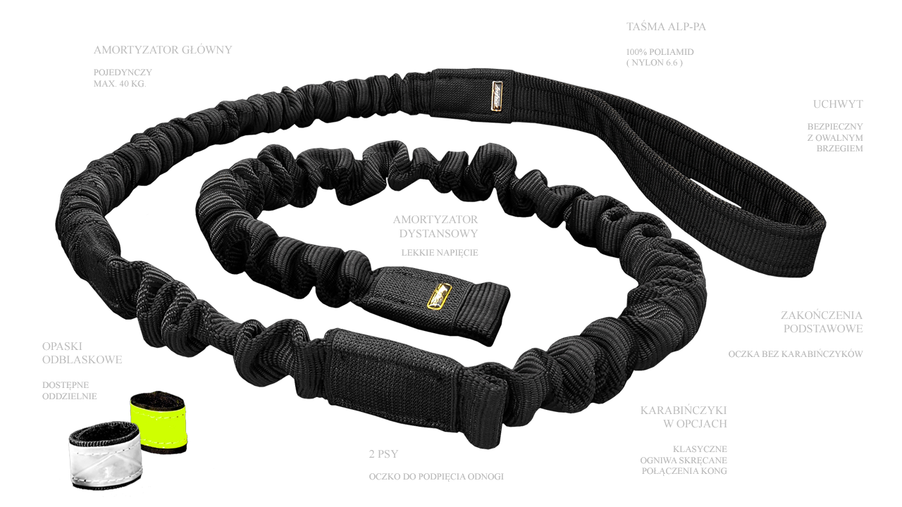 Smycze amortyzowane są dostosowywane do wagi psa/drużyny pod względem siły napięcia, a także wielkości połączenia (karabińczyka).