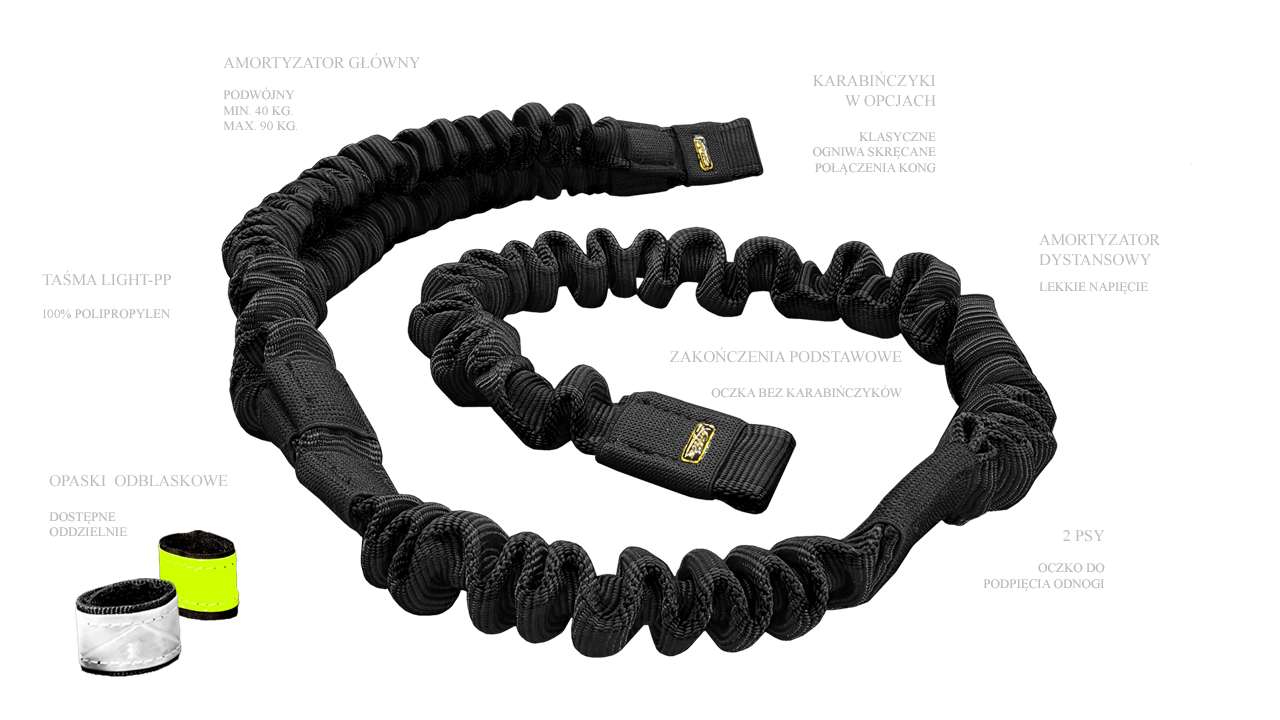 Liny amortyzowane są dostosowywane do masy pieska/drużyny. Tutaj prosimy o wybór wielkości karabińczyków stosownie do wagi, pamiętając o temperamencie - dla spokojnego klienta 45 kg, można wybrać przedział do 40 kg i odwrotnie, dla silnie szarpiącego 35 kg - pow. 40kg.